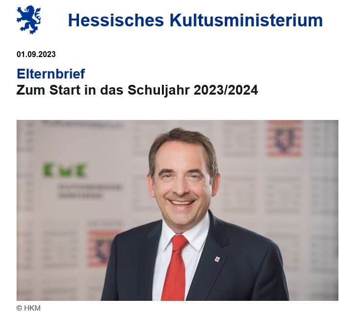 Hier finden Sie den Link zum Elternbrief zum Start in das Schuljahr 2023|2024 im Auftrag von Herrn Prof. Dr. R. Alexander Lorz (Hessischer Kultusminister):